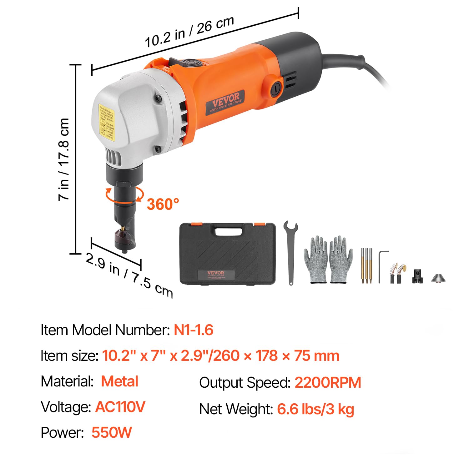 VEVOR Sheet Metal Nibbler, 550W, 2200 RPM Speed, 360 Degree Rotation Electric Nibbler Metal Cutter, Lightweight, Straight Curve and Circle Cutting for Stainless Steel, Aluminum, Plastic, Wood Board