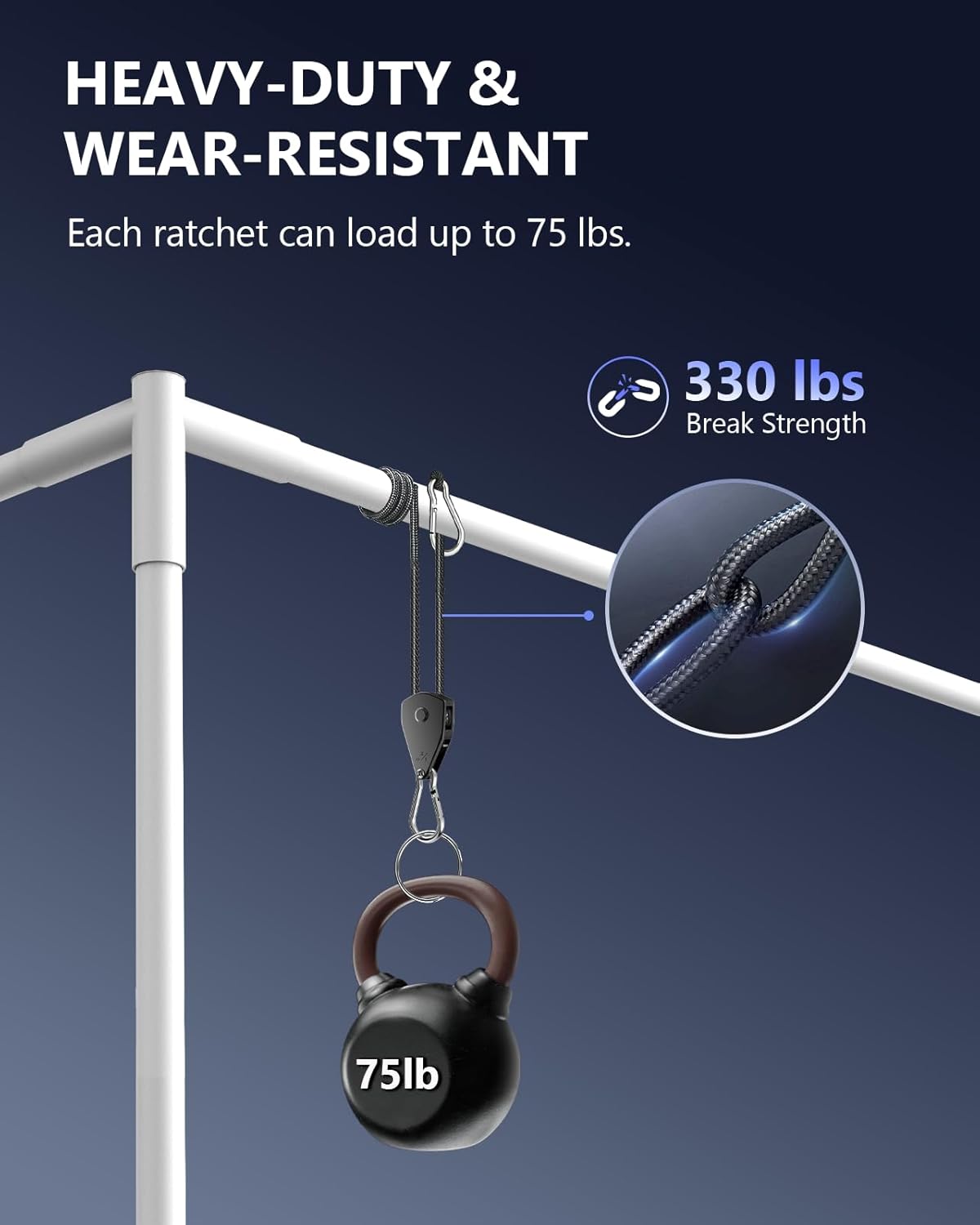 - Built to Last: The ratchet straps are durable, tear-resistant, and rust-proof with a weight load capacity of up to 75 lbs per ratchet and 300 lbs per 4-pack