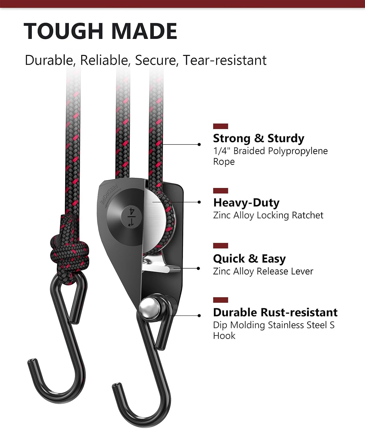 - High-Quality Materials: The ratchet tie downs are made of solid braided polypropylene rope, reinforced with metal gears, and equipped with high-strength, rustproof galvanized iron carabiner hooks