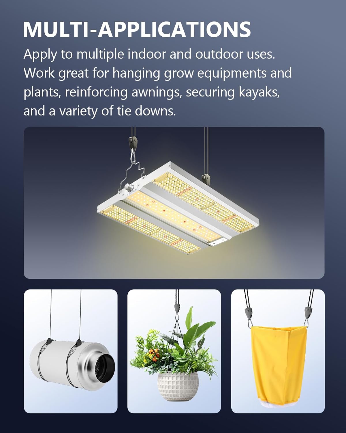 - Widely Applicable: The hanging clips are perfect for indoor hanging applications, such as plants, grow equipment, and aquarium lights, as well as for many outdoor tie-downs, such as tarps, covers, camping tents, bags, canopies, awnings, banners, and more