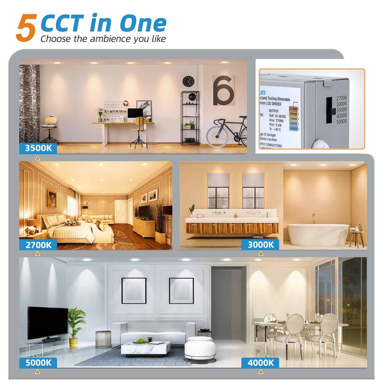 - 【5 Color Temperature】Just a slide on the side of the box, and choose 2700K/3000K/3500K/4000K/5000K-5 color temperature selectable to meet your mood, erasing the trouble of returning or replacing 6 inch led recessed light due to improper color temperature.