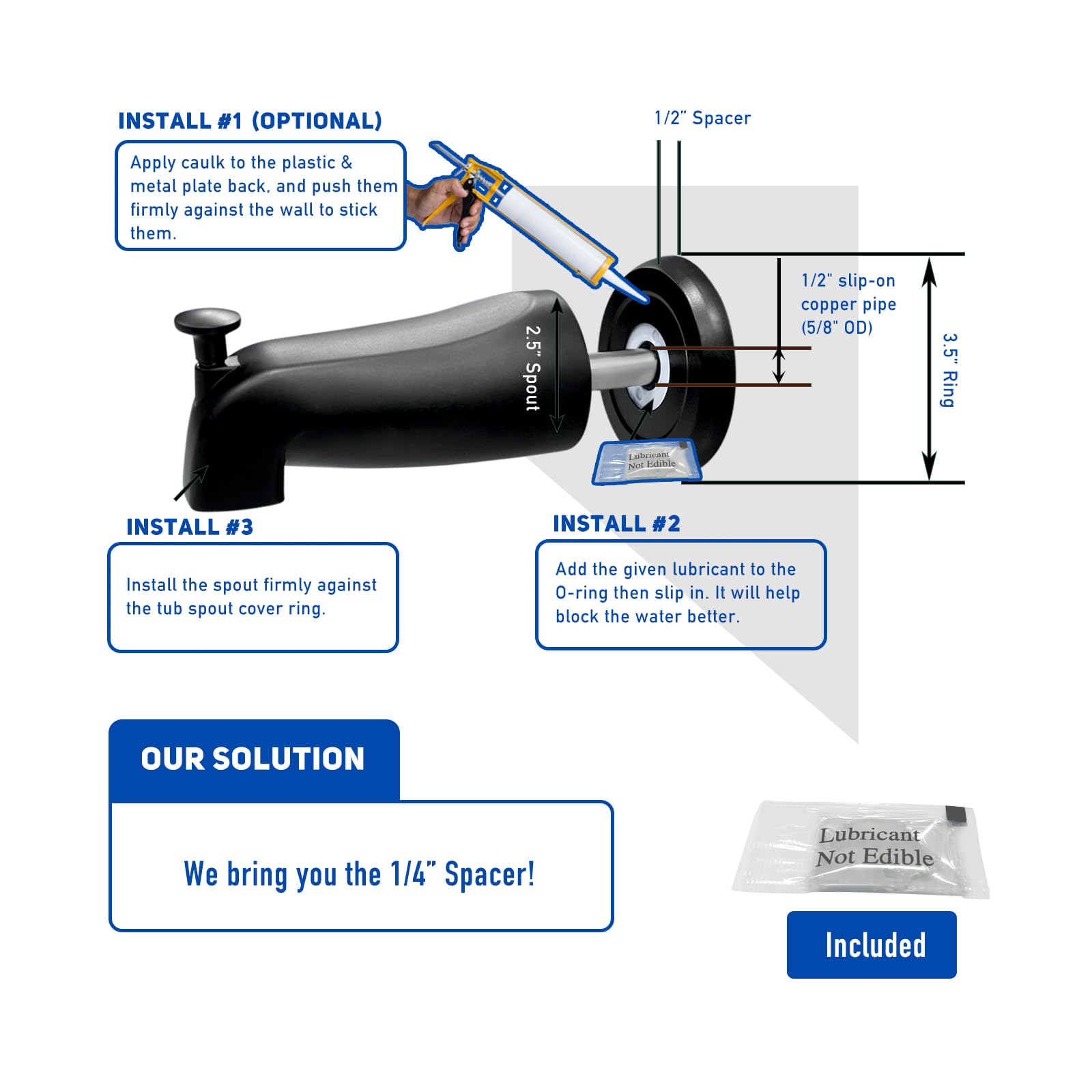 - 【1/2" Spacer】Our tub spout ring is designed for a 1/2" gap of the tub spout to the wall. The spout flange is not intended for any other sizes. If you are looking for other tub spout spacer sizes, kindly try other products, or wait for our new bath faucet ring to arrive. We will add other tub faucet flange sizes as soon as possible. The product is not tub spout ring matte black style but chrome. Kindly pay attention to the color too.