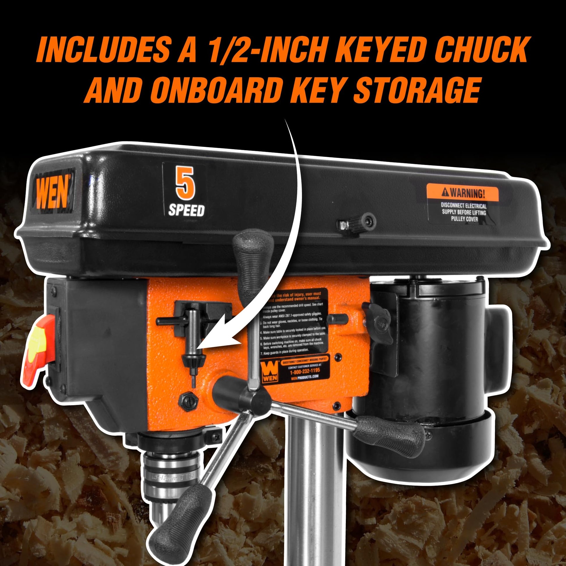 Details: Remember when you could drill with maximum accuracy? Power through metal, wood, plastics, and more with the WEN 8-Inch 5-Speed Drill Press. Don’t let our compact design fool you. Between the five operating speeds, the two-inch spindle travel, and the sturdy construction, you’ll have way more precision than a standard handheld drill. Our 2.3-amp induction motor features ball bearings for smooth balanced performance even at high speed. Manually set your speed to either 750, 1100, 1500, 2100, or 3200 RPM by adjusting the belt position on the two spindles. The easy-to-read, locking depth stop allows for accurate and repeatable drilling operations. The keyed chuck with JT33 spindle taper accepts bits ranging from 1/20 to 1/2 inch in diameter (1.5 to 13 mm). The table bevels 45° left and right for angled drilling. The base is designed with holes for mounting onto a bench or work stand. Clamps and vises are easily mounted to the slotted table, making work-holding safe and effective. And because its a WEN product, your drill press comes backed by a two-year warranty, a stocked inventory of replacement parts, and a helpful customer phone line. Remember when you could drill holes in almost anything? Remember WEN.