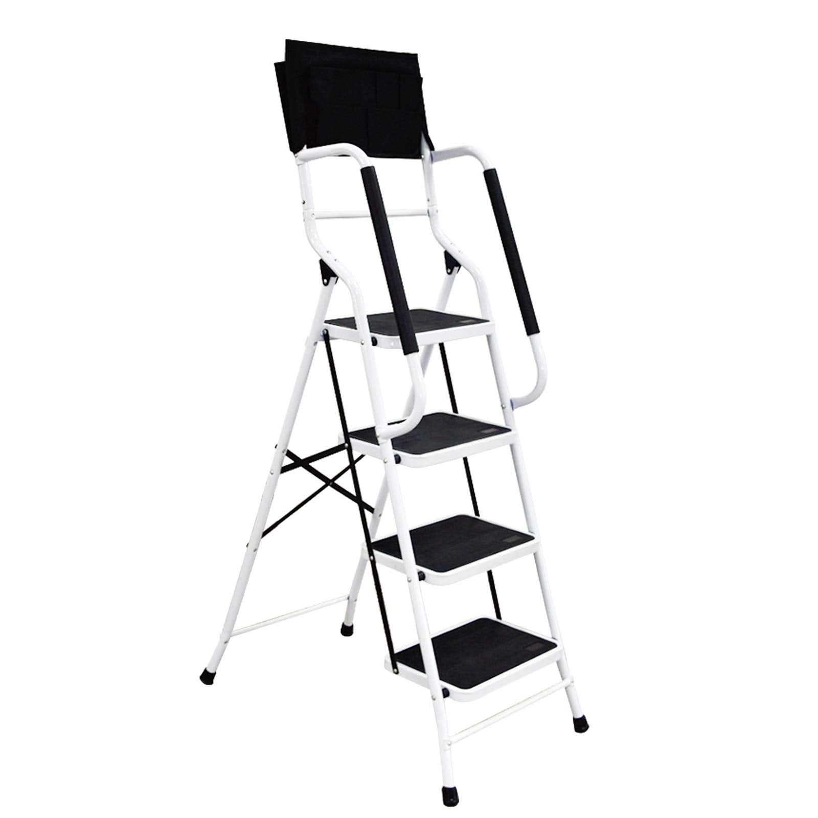 - Space Saving Folding Design---When you don't use the ladder,fold up and store it against a wall or corner,can also easily slide it in your car's backseat, or store it away in your closet or under your bed,won't use much space.Just tilt ladder forward and release the safety lock which is hidden on the bottom of the top pedal,then lift up the back of top pedal,you can fold it easily.