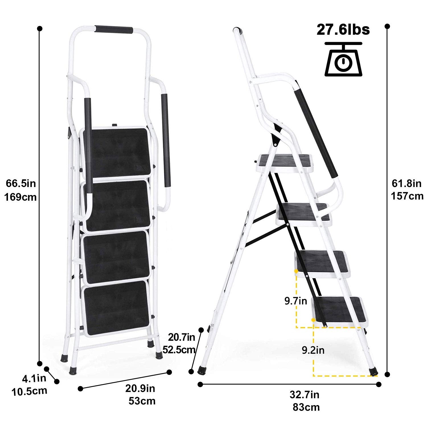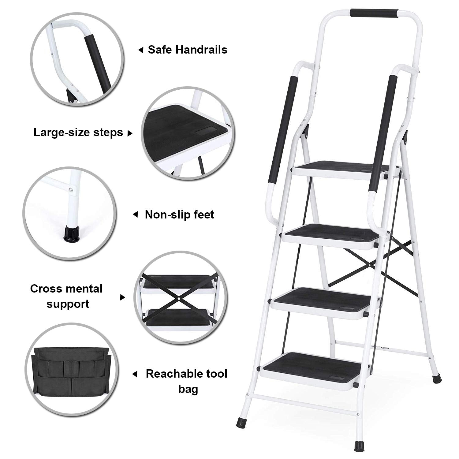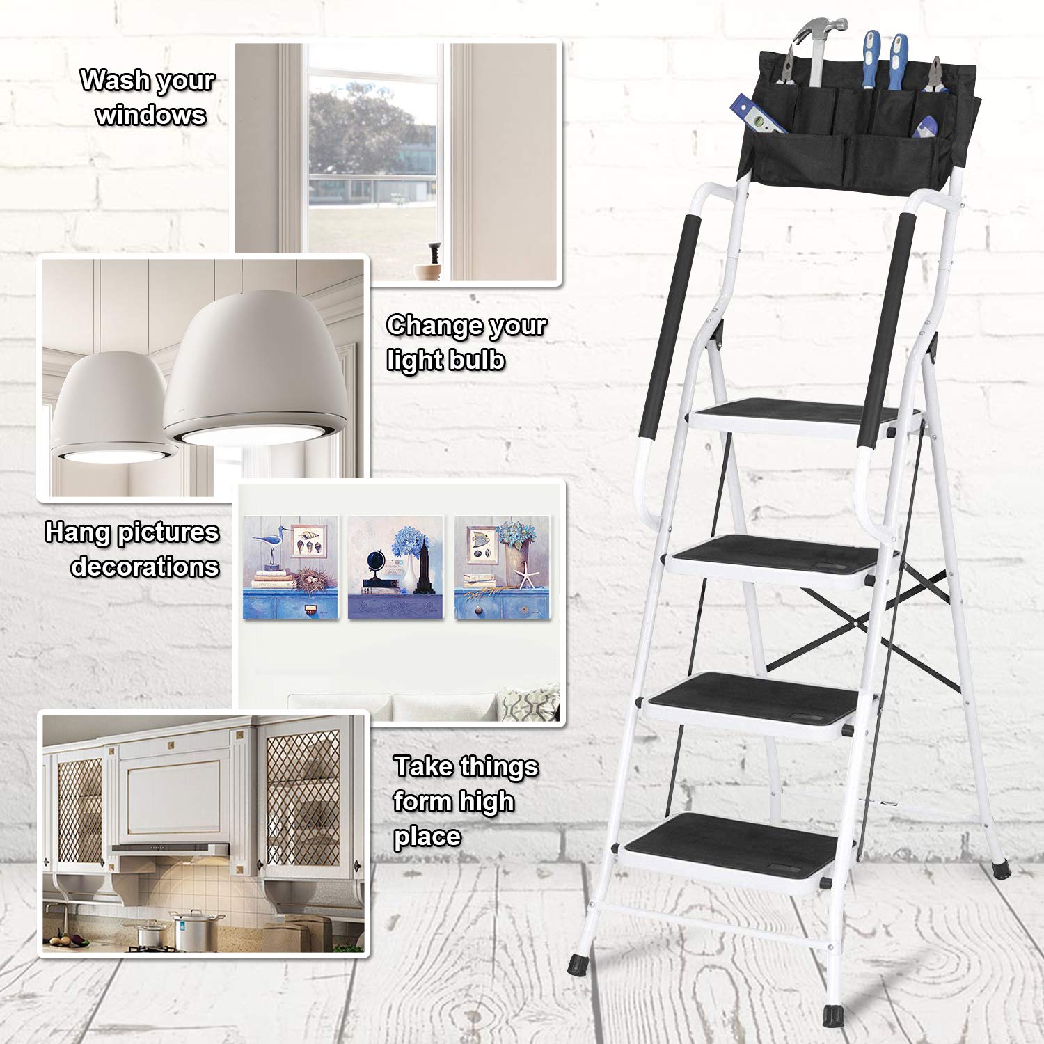 Wiberwi 4 Step Ladder with Handrails 500 lb Capacity Step Stool Folding Portable Ladders for Home Kitchen Steel Frame with Non-Slip Wide Pedal Stepladder with Attachable Tool Bag White