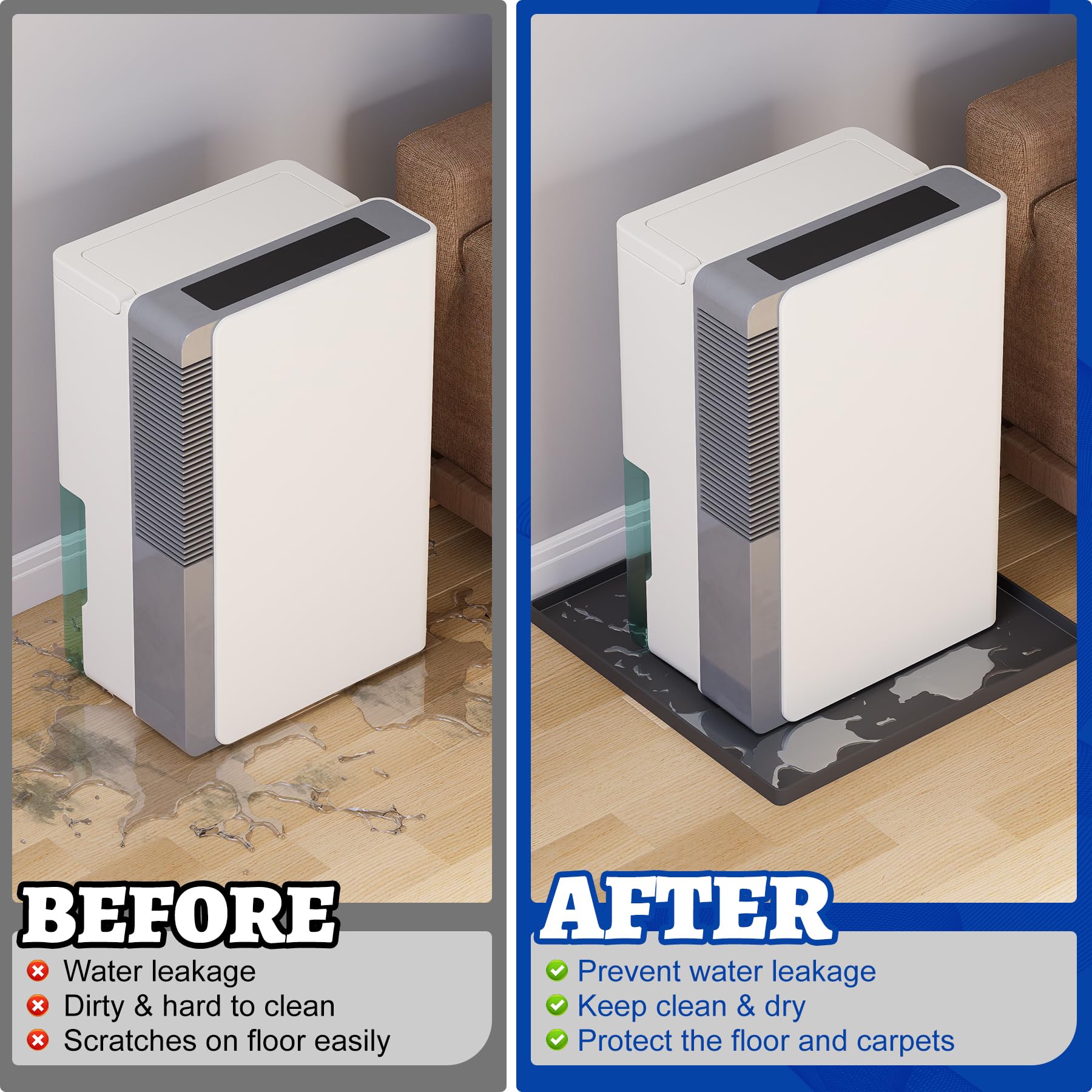 - 【Professional Waterproof Material】Our dehumidifier mat is made of thickened silicone, durable, anti-slip, and scratch-resistant. The drain pan provides excellent water storage to prevent overflow while enhancing the dehumidifier’s stability to protect the floor from scratches.