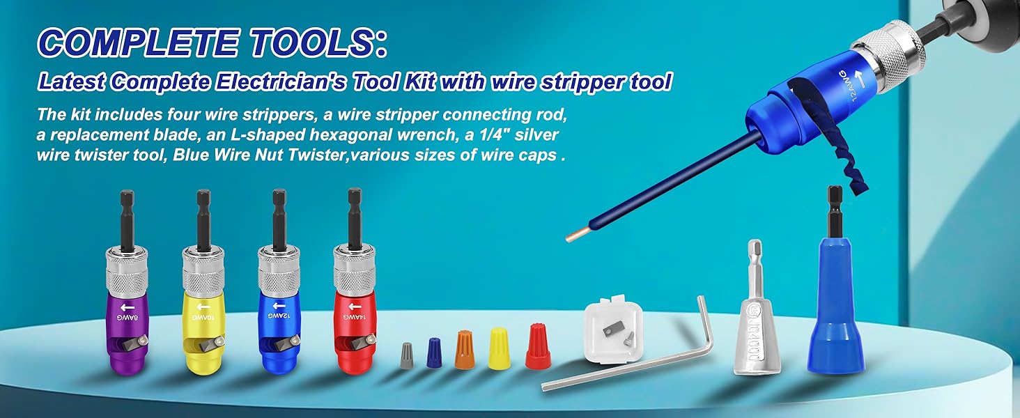 - COMPLETE ELECTRICIAN'S TOOL KIT - Includes 5pcs wire strippers, one wire stripper connecting rod, one wire cap for P1, P2, P3, P4, P5 sizes, one L-type hexagonal wrench, one silver wire twister, and one plastic wire twister.Satisfy stripping, paralleling, insulating and other work content.This product is suitable for 8-10-12-14AWG specifications of Teflon wire, THHN, UL1007, UL1015 and other types of wire groups.The weight of a set of products is about 1.38lb