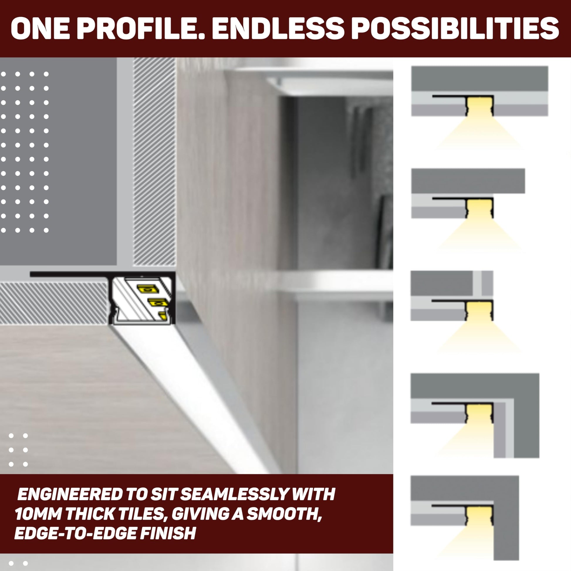 - CREATES CONTINUOUS LINEAR LIGHTING When paired with a high-density LED strip and opal diffuser, this profile minimizes LED dots and produces a smooth, uniform line of accent light across tiled surfaces.