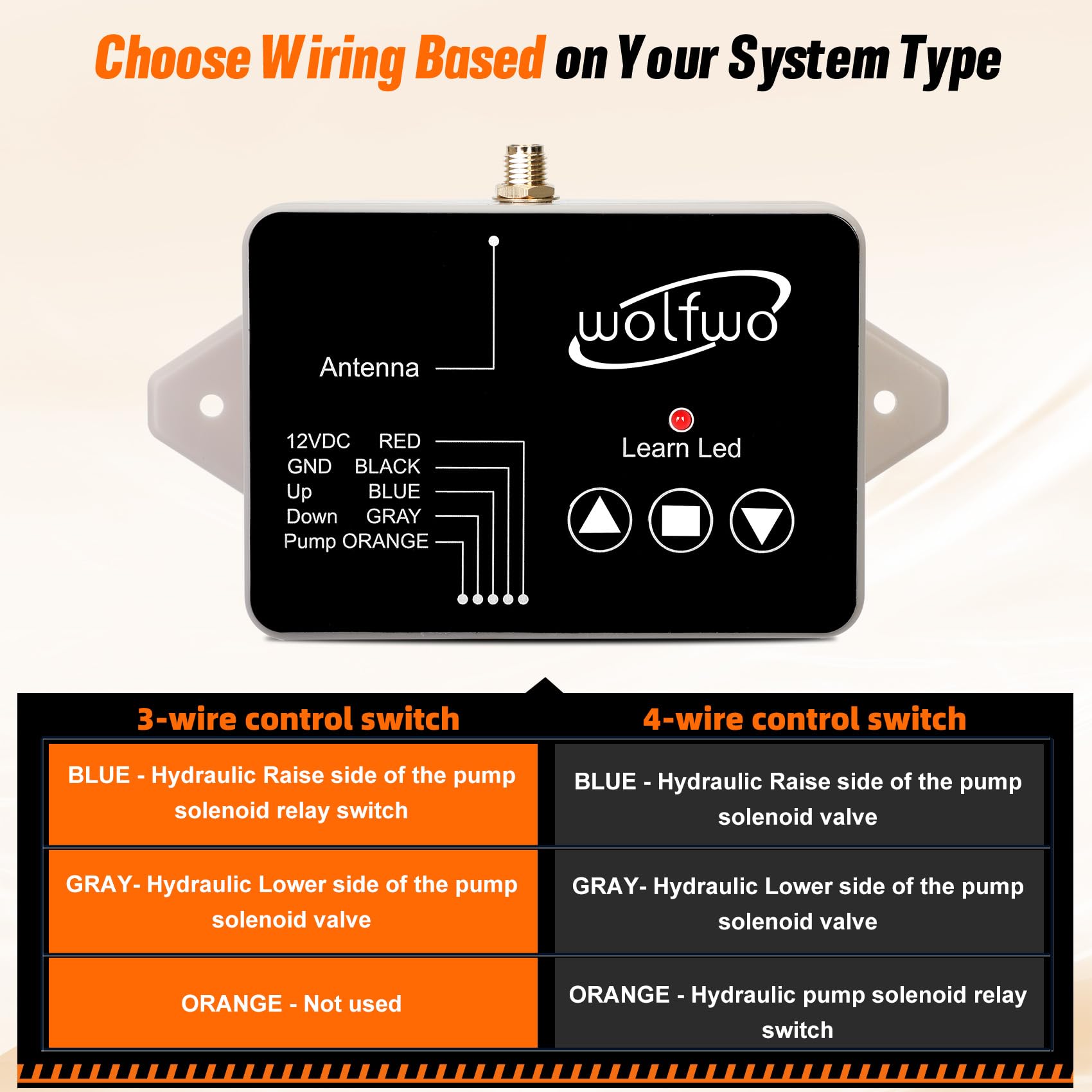 - EASY INSTALL-Get set up in minutes! Compatible with 3-wire or 4-wire hydraulic dump trailer. Clear color-coded wiring (Red=+12V, Black=Ground, Blue=Up, Grey=Down, Orange=Pump) and simple remote pairing make DIY installation a breeze. Includes detailed instructions