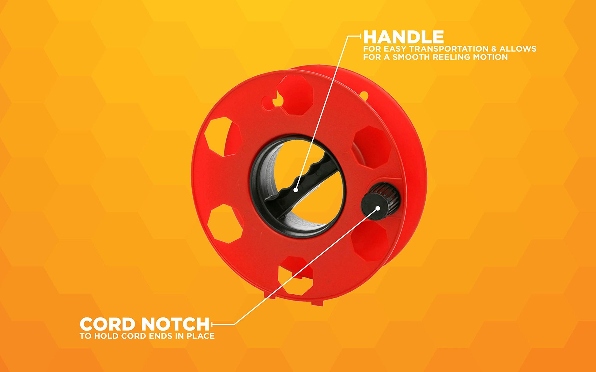 - LIGHTWEIGHT design with handle for easy transportationEasy to grip center handle allows for a smooth reeling motionIncludes hook to keep cord in place after being reeled up and put into storage