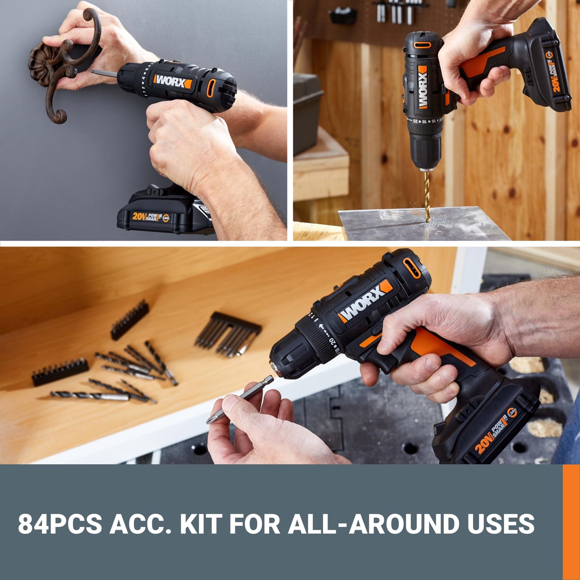 Worx 20V Cordless Drill Driver, 84pc Accessory Kit, Variable 2-Speed, 265 In-Lbs Torque, 20+1 Clutch, Lightweight, Compact, 3/8-Inch Keyless Chuck - Battery & Charger Included