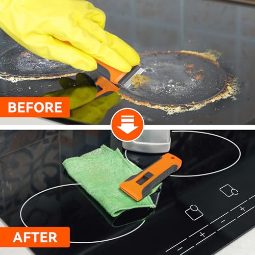 - Multi-Surface Versatility: Use our razor blade scraper to conquer oven carbon, stove burner grime, bumper stickers, window frost, and tile caulk. Angled blade edge lifts messes on glass, ceramic, metal without gouging