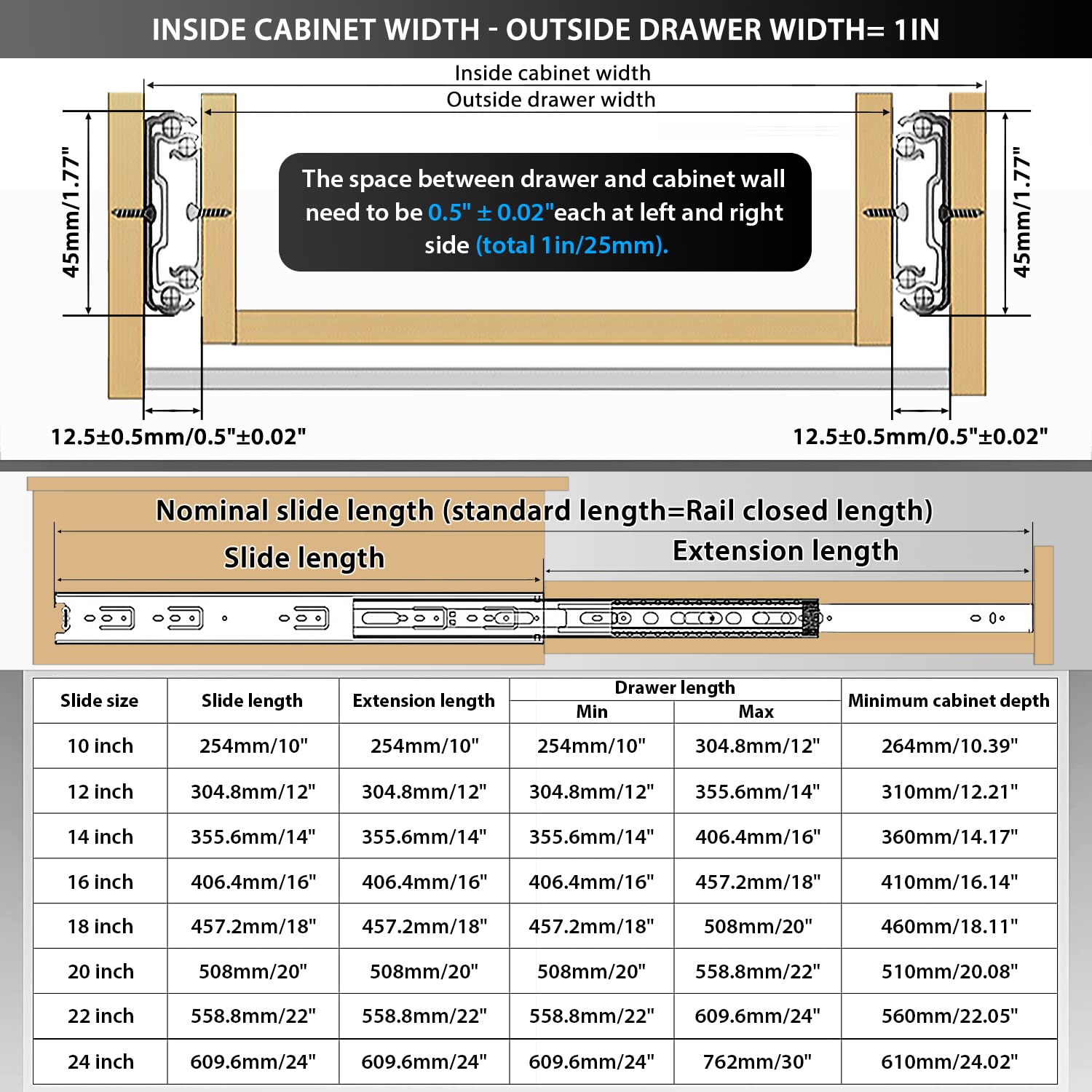 - 【Installation note】Slide length:12"(307mm)--Fully extended length:24"(609mm).Quantity: 1 pair(2 pieces)一Suitable for drawers with an internal depth of ≥ 12"-14".The space between drawer and cabinet wall need to be 0.5in each at left and right side,total 1in ( inside cabinet width - outside drawer width= 1in ),Mounting screws included.