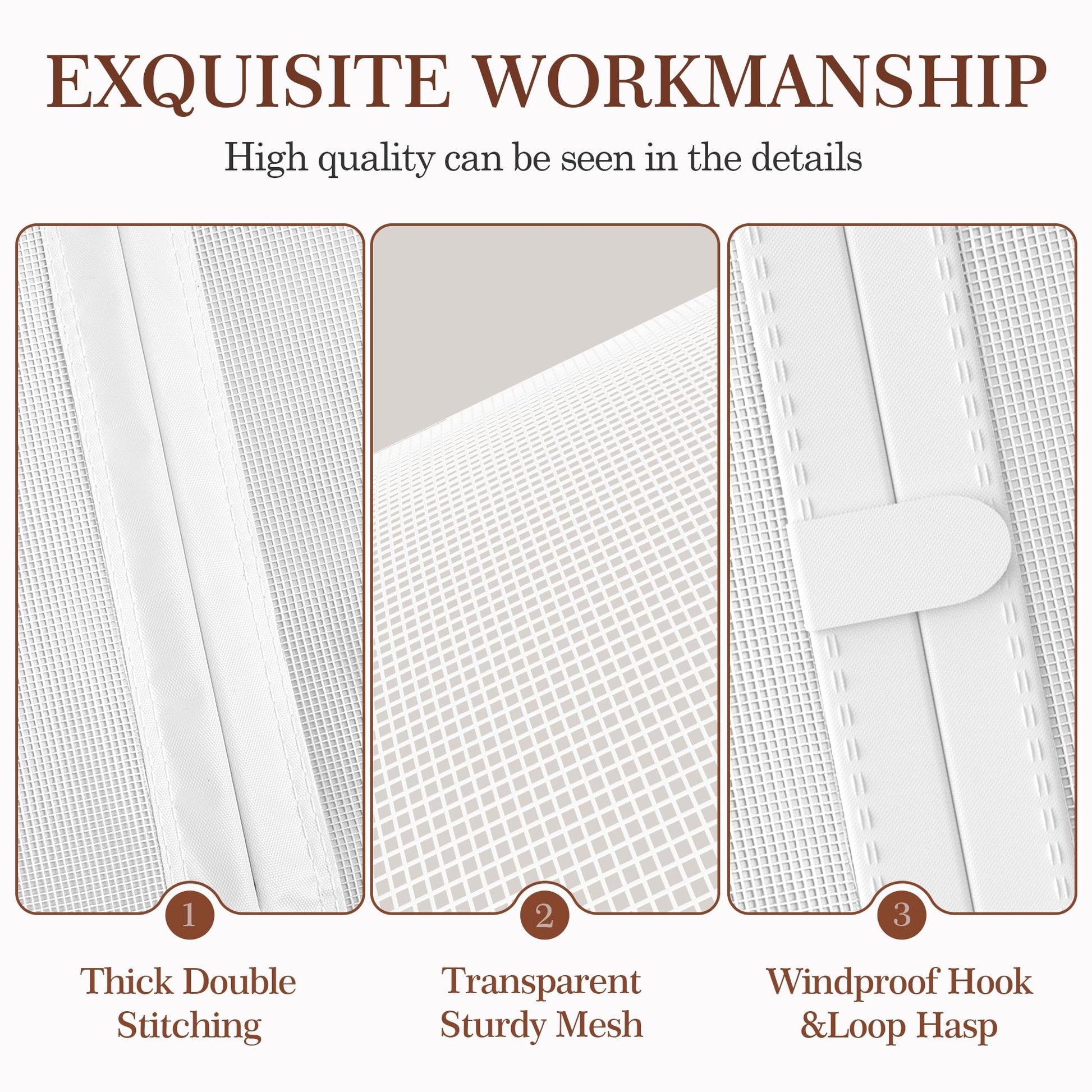 - UPGRADED AND STRENGTHENED: The screen curtain is wrapped with thickened webbing in four sides, more sturdy than other fabrics, not easy to break. Thicker thread used in the whole stitching; 6 needles per inch, more close and apparently sturdier than most other products which is three and a half needles per inch
