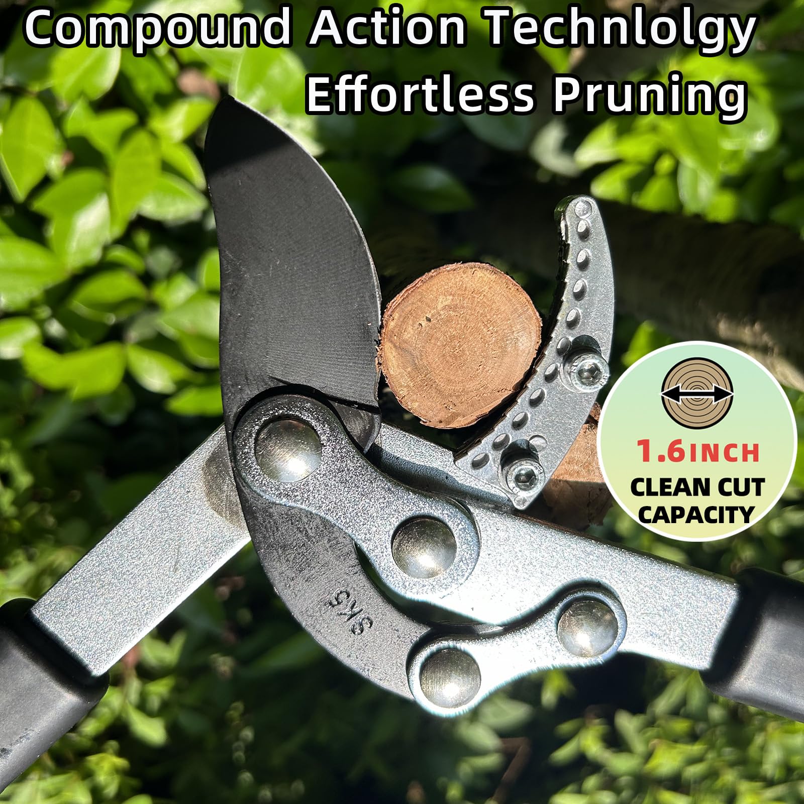 - SAVE YOUR EFFORT: long handle tree pruner compound action technology up to provide 4 times more power when cutting branches, you will able to effortlessly cut thick or dry branches, even for older people. Tree trimmers long handle pruner effortless pruning will let you enjoy in gardening