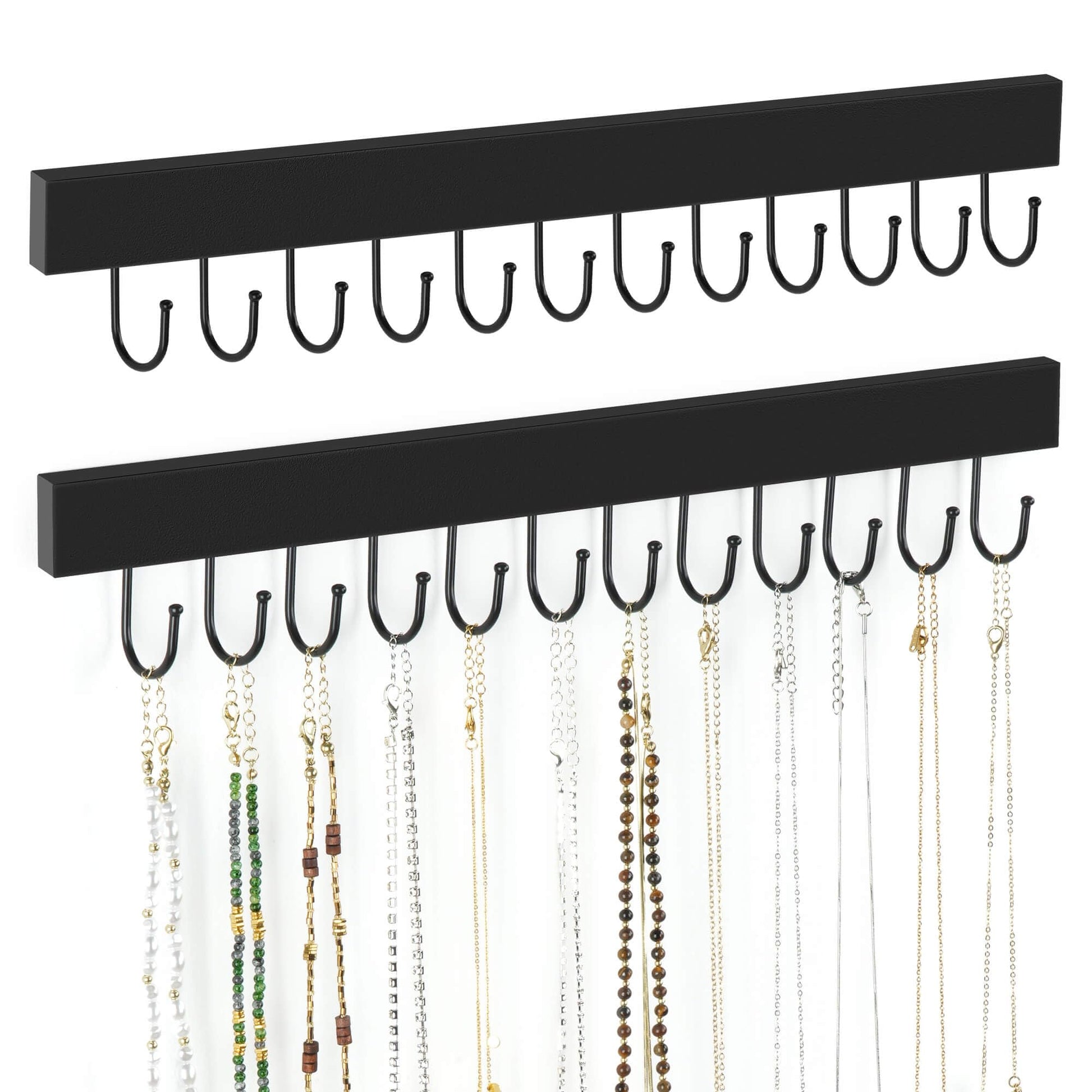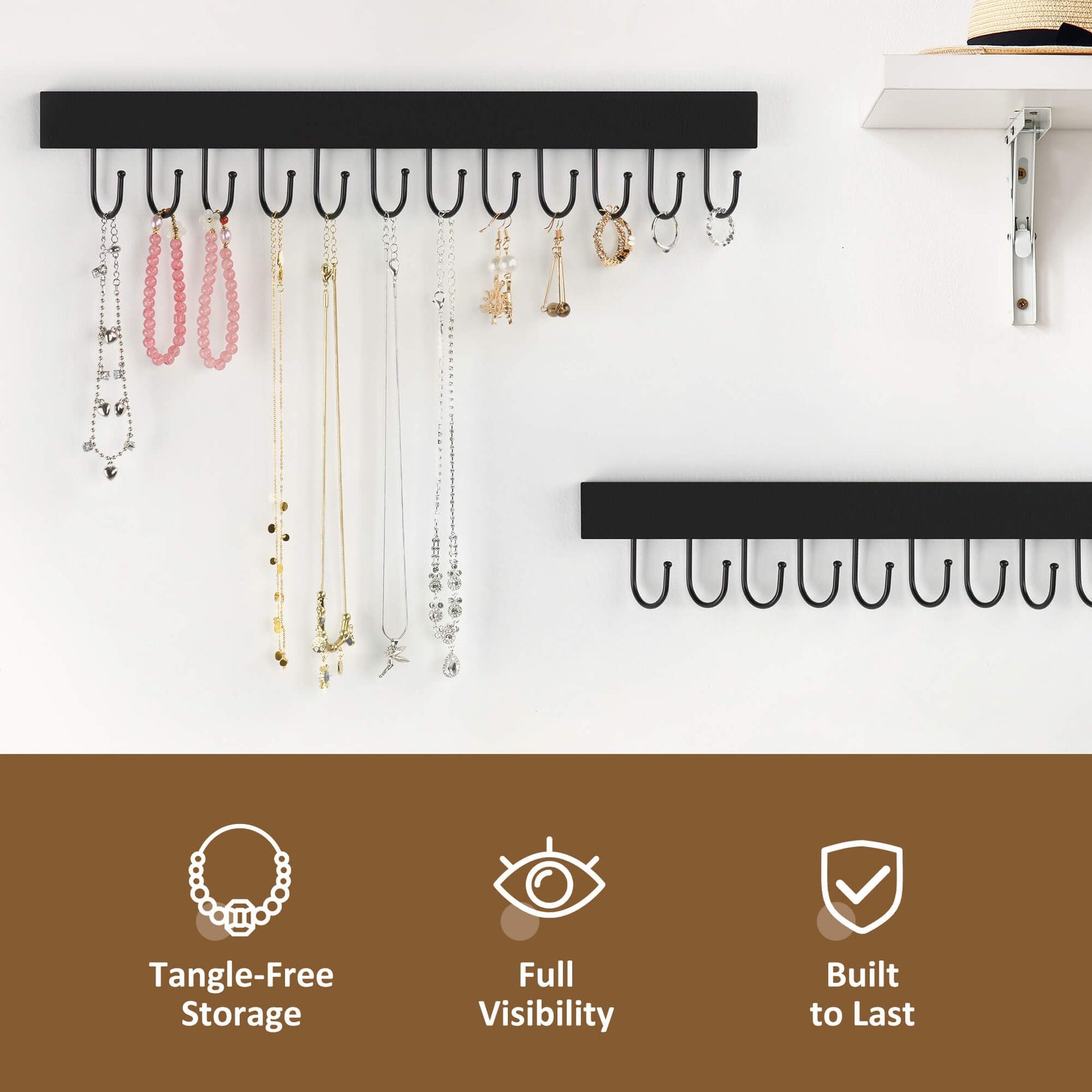 ZEDODIER 2 Pack Necklace Organizer Wall Mount, Wooden Jewelry Hanger Necklace Holder with 24 Hooks,Hanging Jewelry Organizer, Black