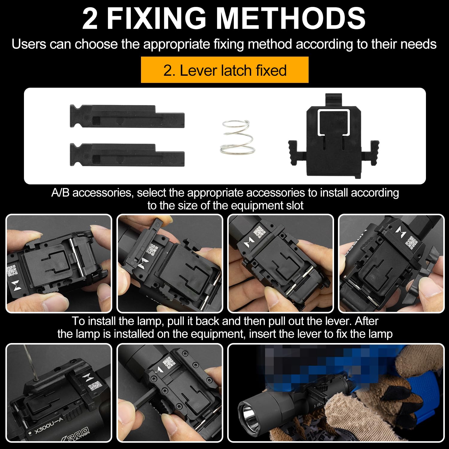 - 【2 installation methods】1. A/B accessories, select the appropriate accessories to install accordin to the size of the equipment slot. To install the lamp, pull it back and then pull out the lever. 2. After the lamp is installed on the equipment, insert the lever to fix the lamp.